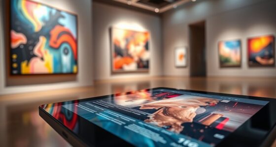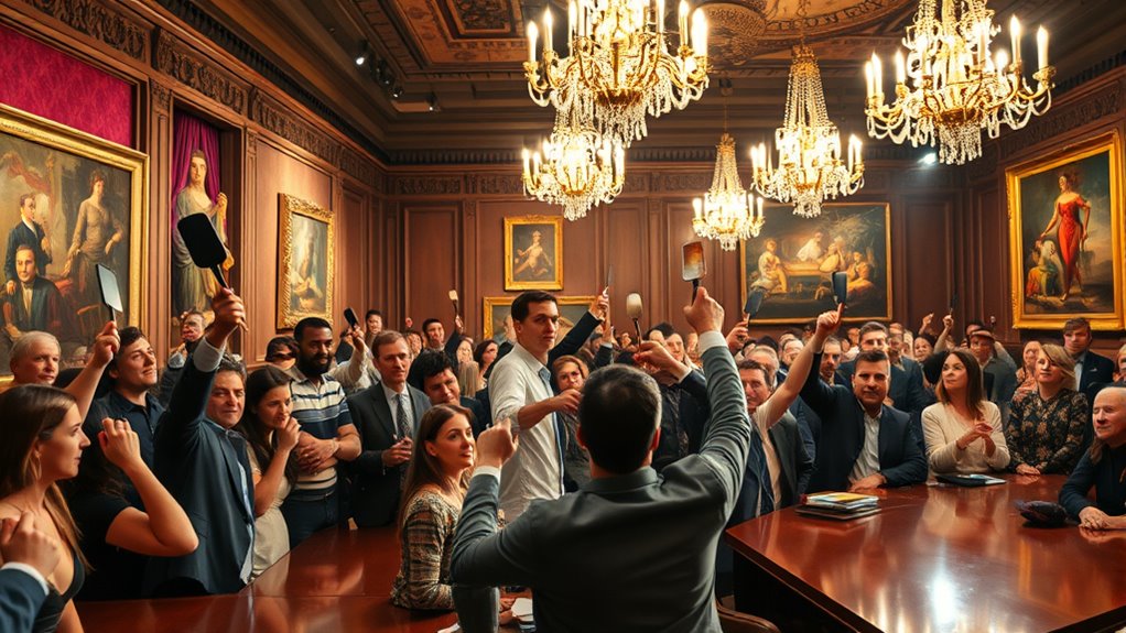 In art auctions, bidding wars happen when buyers strategically outbid each other, influenced by market trends, perceived value, and timing. Fees like premiums and additional costs can push prices higher, making it vital to manage bids wisely. Knowing how to escalate or hold back bids helps avoid overpaying. By understanding these dynamics, you can increase your chances of winning at a fair price—discover more about how to master this process as you continue exploring.