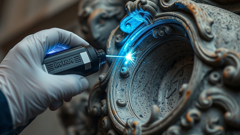 Laser cleaning offers a precise, eco-friendly way to restore artifacts without risking damage to delicate surfaces. It effectively removes dirt, corrosion, and contaminants while preserving the original materials and details. This method is versatile, safe for various materials, and enhances efficiency compared to traditional techniques. Its environmentally conscious approach reduces chemical waste and physical contact, ensuring ideal preservation. Keep exploring to discover how laser cleaning can revolutionize conservation efforts and protect our cultural heritage.