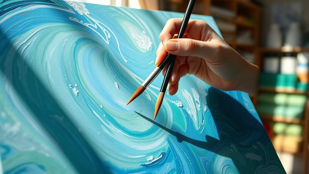 You might find that abstract landscapes and watercolor therapy are particularly effective for calming. These styles allow you to express emotions freely and focus on the soothing process rather than perfection. Abstract landscapes can evoke tranquility through natural imagery, while watercolor therapy offers gentle, flowing movements that help reduce stress. Engaging regularly in these painting types can enhance your mood and promote a calm, centered mind.