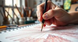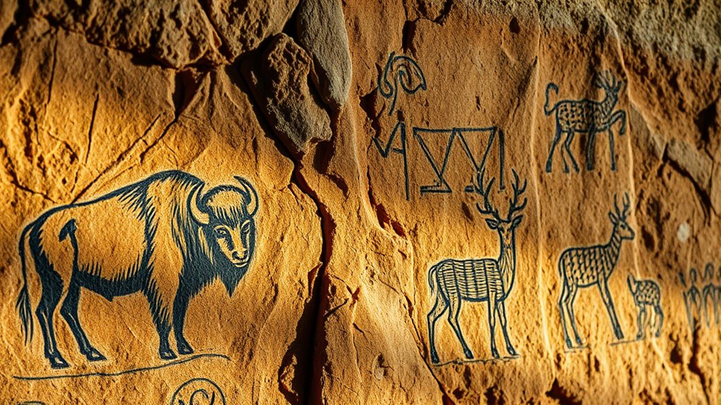 Ancient cave paintings offer a fascinating glimpse into early human life and their way of expressing themselves. As you study these images, you realize they aren’t just random scribbles; they hold symbolic meanings that reveal how our ancestors viewed their world. These symbols may have been used to convey messages across generations, emphasizing their importance in early communication. These symbolic meanings help you understand the mindset of early humans, showing that their art was more than decoration—it was a form of communication. Deciphering these symbols is a complex task, but it provides invaluable insights into their lives and beliefs. You also notice the artistic techniques used in these paintings, which tell you a lot about their skills and intentions. Early artists employed various techniques, from simple outlines to detailed shading, to bring their images to life. They used natural pigments derived from minerals, plants, and charcoal, demonstrating an understanding of their environment and resourcefulness. The way they applied these pigments—whether with fingers, brushes, or blowing pigment through hollow bones—shows their ingenuity. These artistic techniques weren’t just about creating a realistic depiction; they often served symbolic purposes, emphasizing specific features or themes. For example, some paintings highlight the musculature of animals, perhaps to emphasize strength or importance in hunting rituals. You realize that these techniques were carefully chosen to convey specific messages, blending art with storytelling and ritual. As you explore more deeply, you find that the creative methods and symbolic meanings are intertwined. The use of certain colors or shapes might signify particular ideas or spiritual concepts, revealing a rich symbolic language. You see that the paintings were crafted with intentionality, not just as spontaneous expression but as deliberate communication. This understanding makes you appreciate the complexity and depth of early human culture. Additionally, modern scientific tools, such as chemical analysis, are helping researchers uncover even more details about the materials and processes used by ancient artists. These technological advances reveal the complexity of materials and techniques employed, further enriching our understanding of early artistic practices. Moreover, recent discoveries of hidden pigments and layered compositions demonstrate the innovative techniques employed by ancient creators, showing their mastery and depth of knowledge. Scientific methods like spectroscopy are increasingly used to analyze pigment composition without damaging these priceless artworks. Scientists are still uncovering the secrets behind these ancient artworks. Advances in technology, like 3D imaging and chemical analysis, allow you to explore hidden layers or original pigments that have faded over time. Every new discovery helps decode the symbolic meanings embedded within the art and uncovers new artistic techniques. This ongoing research continues to challenge assumptions, revealing that these paintings are more than just primitive sketches—they’re sophisticated records of early human thought, spirituality, and social organization. As you learn more, you realize that ancient cave paintings are not just artifacts; they’re essential keys to understanding the origins of human creativity and expression, still speaking to us across thousands of years.