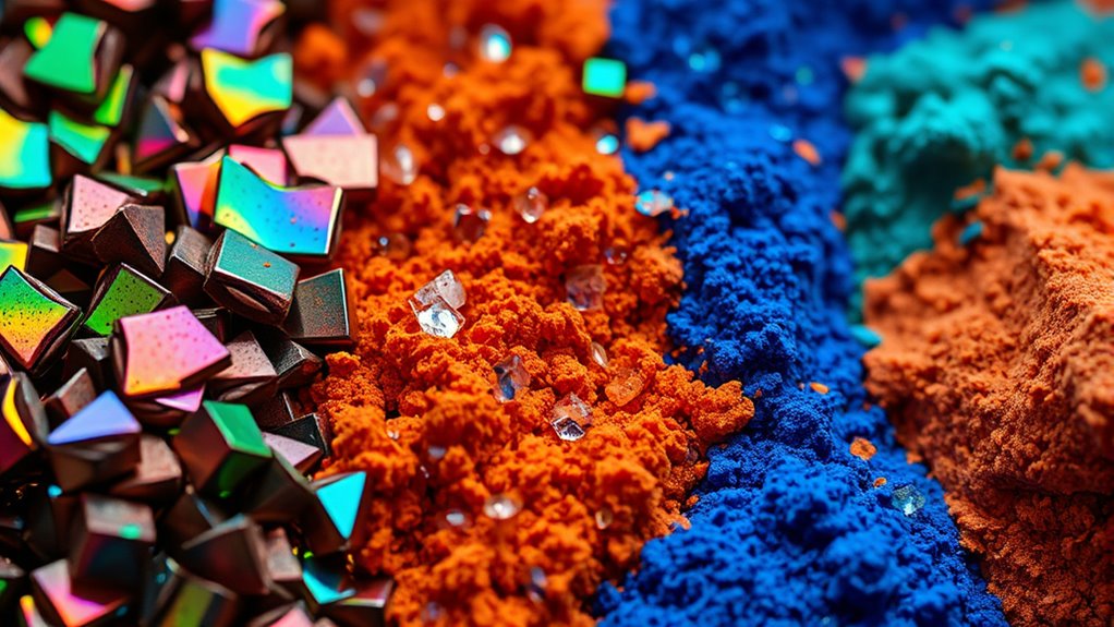 Understanding the science of pigments reveals how natural compounds like crushed beetles create vibrant dyes, thanks to their unique molecular structures that absorb specific light wavelengths. Modern advances include quantum dots—tiny particles with tailored properties that produce bright, stable colors for tech and medical uses. Studying how these pigments interact with light helps develop eco-friendly dyes and innovative materials. Continue exploring to discover how this fascinating science shapes the colors around us.
