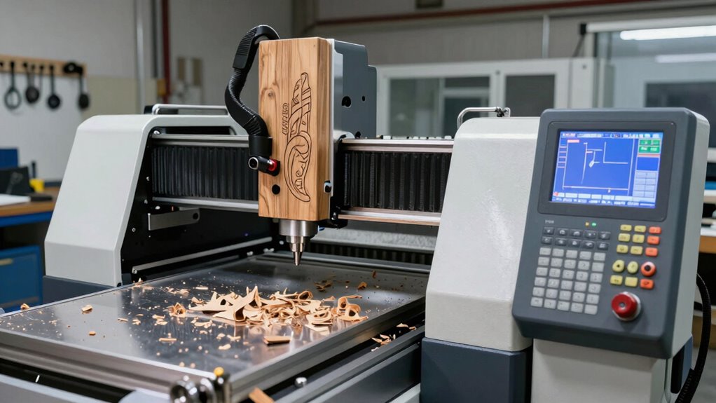 Like Da Vinci’s sketches, CNC machines can craft intricate 3D sculptures for your art projects. By combining precise 3D modeling and careful material selection, you can produce detailed, lifelike pieces. The machine’s accuracy allows for complex textures and forms, transforming your digital designs into tangible masterpieces. Just guarantee you optimize your designs for CNC cutting, and choose the right materials to bring your artistic vision to life with professional finesse.