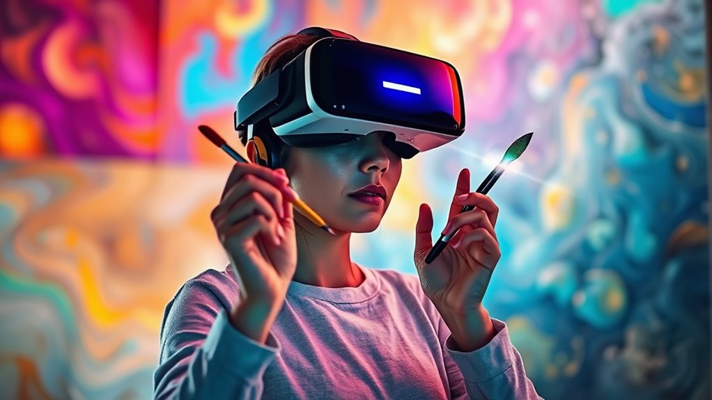 Furthermore, VR art therapy often incorporates interactive features, like guided meditations or prompts, that enhance self-awareness. These tools help you focus your intentions and deepen your emotional insight. The immersive nature of VR encourages full engagement, making it easier to stay present and connected to your feelings. Incorporating digital self-expression techniques in therapy can also improve motivation and adherence to treatment plans, as engaging with technology often increases interest and participation. Over time, this consistent practice can strengthen your ability to regulate emotions and develop healthier coping strategies. As you harness immersive creativity and digital self-expression through VR, you’re not only exploring artistic outlets but actively participating in your emotional healing process, making therapy more engaging, personalized, and effective.