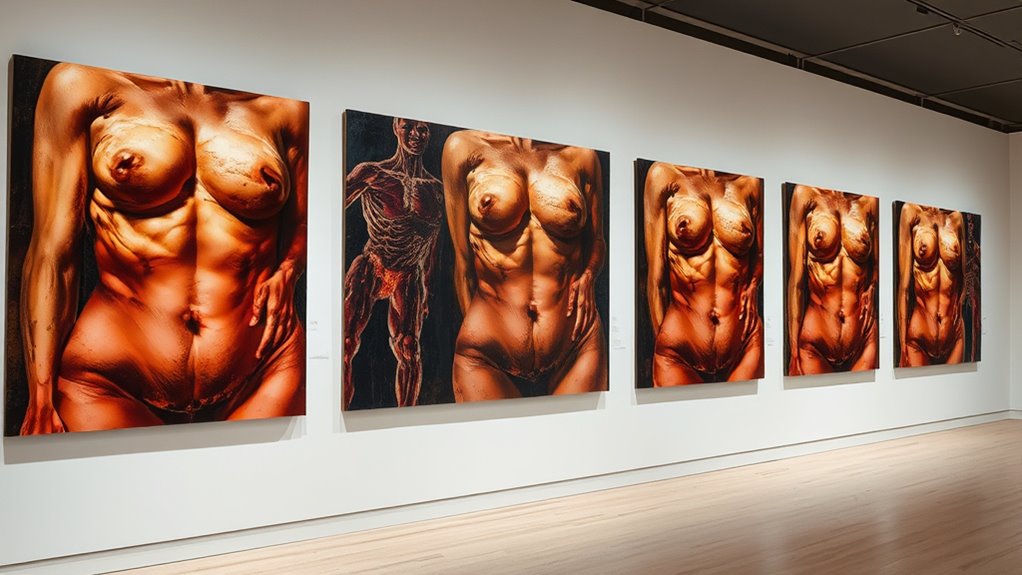 You’ll notice recurring themes of body positivity and bodily autonomy in Saville’s work. She challenges traditional ideals by portraying women’s bodies honestly, embracing imperfections and rawness. Through her bold, unidealized depictions, she invites you to reconsider societal standards and celebrate women’s diverse forms. Her focus on authentic representation encourages you to view the female body as a powerful, autonomous entity, not just an object of beauty.