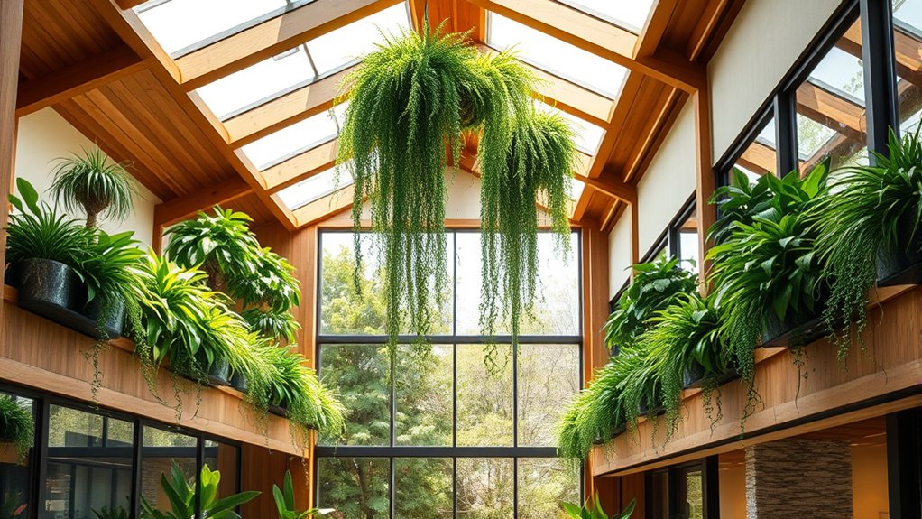 Biophilic architecture brings nature indoors by incorporating plants, natural light, and open spaces into your environment. It creates healthier, more inviting spaces that boost your mood and focus. You’ll notice improved air quality, natural aesthetics, and greater well-being. Large windows, green walls, and ample sunlight make your space feel lively and grounded. To discover how these elements transform everyday environments and support your health, keep exploring to unseal more insights.