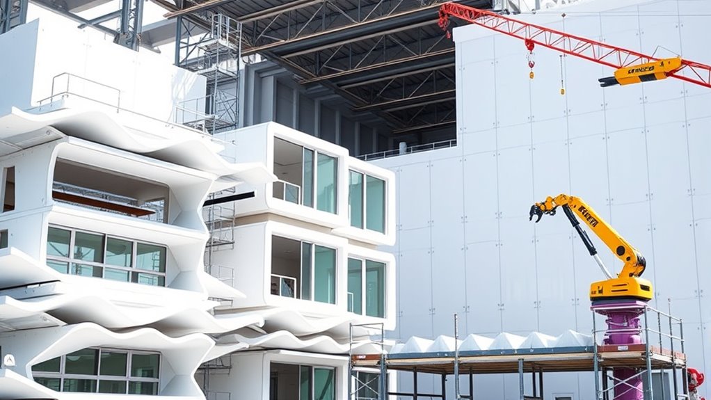 Modular and prefabricated construction help you boost project efficiency by combining factory-made components with on-site assembly. This approach speeds up construction, reduces disruptions, and keeps your project on schedule. It also offers better quality control, minimizes waste, and can lower long-term costs. With fewer weather delays and faster completion times, you gain more predictability and savings. To discover how these methods can transform your projects, continue exploring the key benefits they provide.