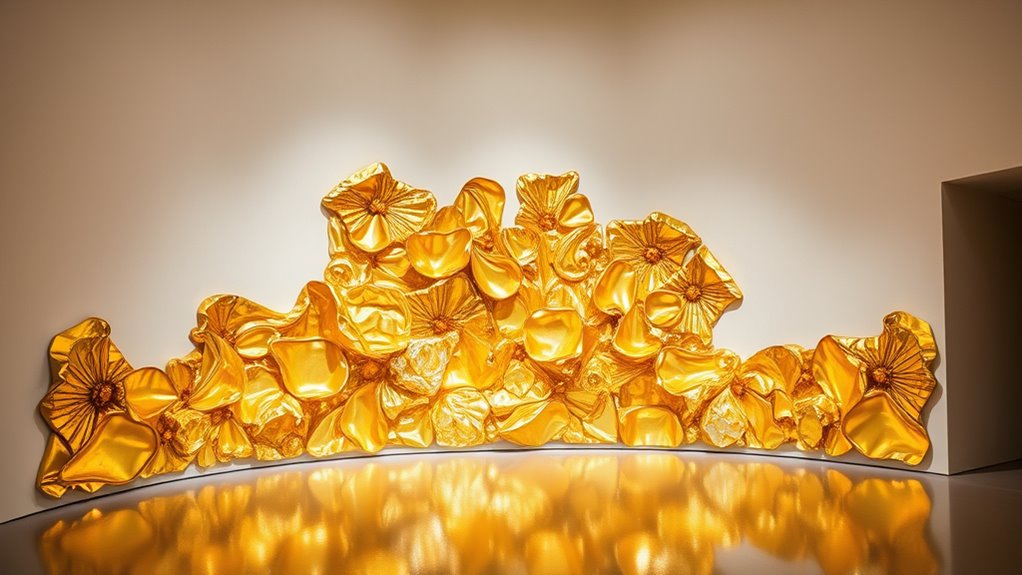 Like a beacon calling out to deep thinkers, the Guggenheim displays this artwork with strategic museum lighting that highlights its textures and details. You’ll find yourself drawn in, engaging actively with the piece as light and shadow dance across it. The display encourages visitor engagement by creating an immersive experience, prompting you to reflect and connect emotionally, making the artwork not just seen but felt on a profound level.