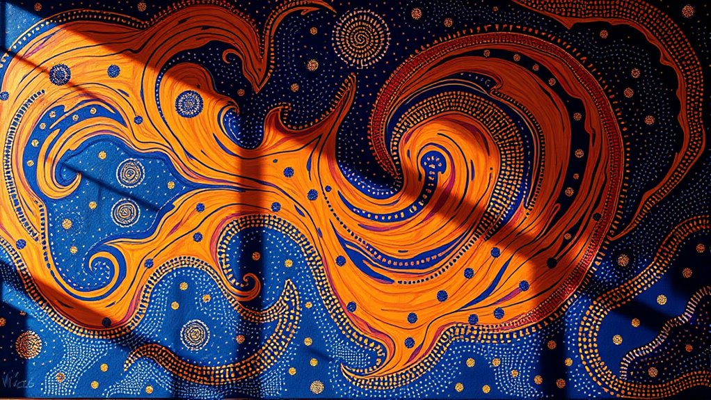 Yes, Indigenous Australian art features unique symbols and motifs tied to Dreamtime stories. You’ll notice symbolic motifs that depict ancestral beings, natural elements, and sacred sites, each telling a story or conveying cultural knowledge. These symbols are deeply meaningful, serving as visual language for transmitting spiritual beliefs and history. By understanding these symbols, you gain insight into Indigenous Australians’ rich spiritual and cultural worldviews.