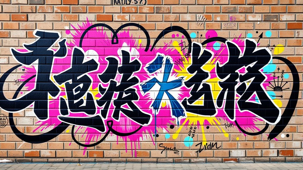Ultimately, hybrid graffiti’s strength lies in its ability to adapt and evolve. Its roots in street art evolution and cultural influences allow it to remain fresh and relevant. As you observe these works, you’ll see how artists are not just creating visually striking images but also forging a dialogue that spans generations and cultures. This art form continues to grow, drawing on the past while embracing the future, proving that blending calligraphy with pop culture is more than a trend—it’s a powerful expression of our interconnected world.