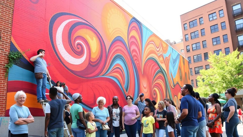 You also benefit from the educational aspect of mural projects. They provide opportunities for learning about art techniques, community history, and social issues. As you work together, you develop skills in teamwork, communication, and problem-solving. The sense of achievement from completing a mural that genuinely reflects your community’s identity is incredibly rewarding. It’s a reminder that collective effort and artistic collaboration can produce not only eye-catching visuals but also meaningful change, bringing people closer and strengthening the fabric of your neighborhood. Additionally, understanding the importance of financial aspects, such as securing funding and managing budgets, can help ensure the sustainability and success of these community initiatives.