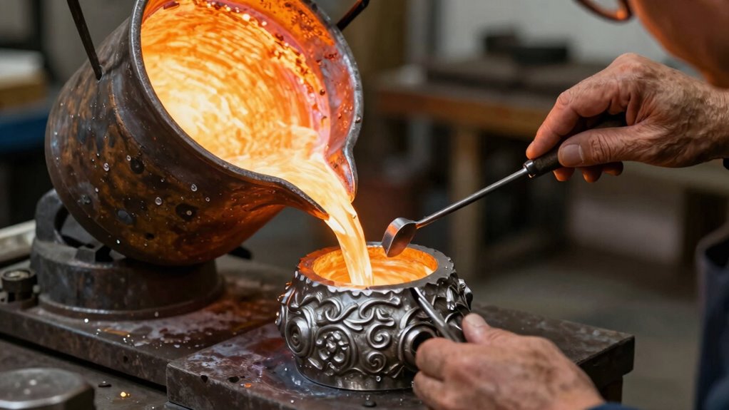 Metal casting for artists involves several clear stages that you can easily follow. First, you create a design and make a pattern, then build a mold around it. Next, you pour molten metal into the mold carefully, allow it to cool, and finally, remove the mold to reveal your cast piece. Finishing touches like cleaning and polishing help perfect your work. Keep exploring these steps to turn your ideas into stunning metal creations.
