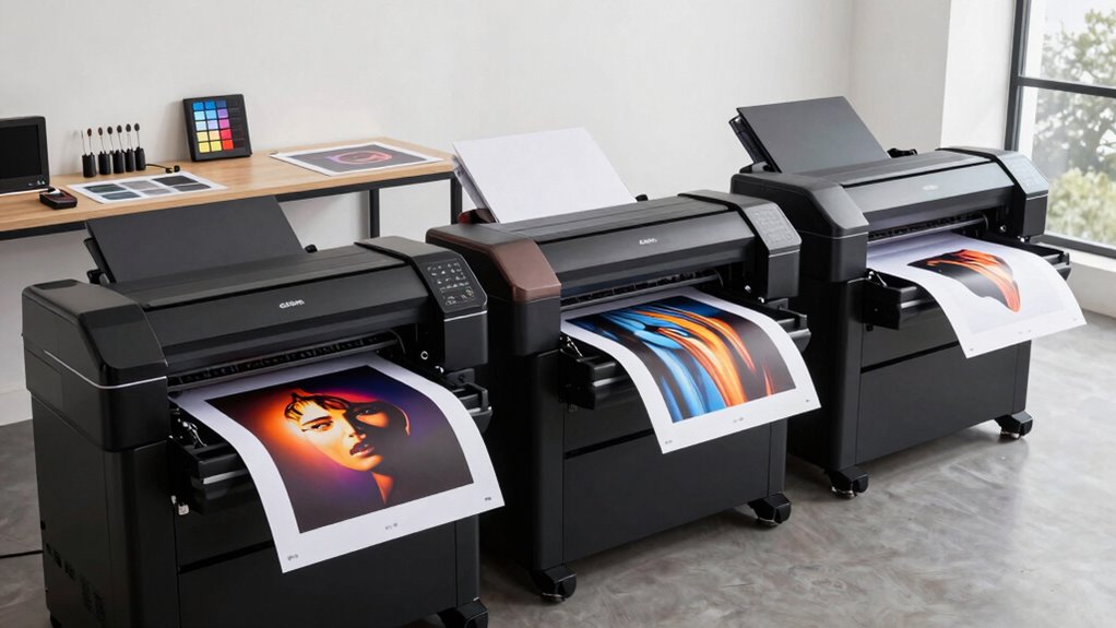 In 2026, I recommend the HP Designjet Z5200 and Z6 for their high-resolution output and media versatility, perfect for professional studios. The Canon imagePROGRAF TC-21 offers excellent quality for smaller projects, making it a versatile choice. Each printer balances durability, fast speeds, and ink system efficiency, helping me produce stunning results reliably. Stay with me to explore how these options can fit your studio needs perfectly.