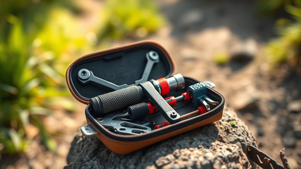 Choosing a bike repair kit that’s easy to use can make a big difference, especially in urgent situations. Look for kits with clearly labeled tools and components so you can quickly identify what you need. An ergonomic design, like comfortable handles or grips, helps reduce fatigue and gives you better control. Simple, straightforward instructions or color-coded parts make repairs easier, even if you’re not a bike expert. A compact, organized storage case ensures everything stays in place and is easy to carry, so you’re ready to fix your bike anytime. Versatile, multi-functional tools also streamline the process, saving time and effort. Overall, a user-friendly kit helps you stay confident and efficient on the road, making roadside repairs less stressful.