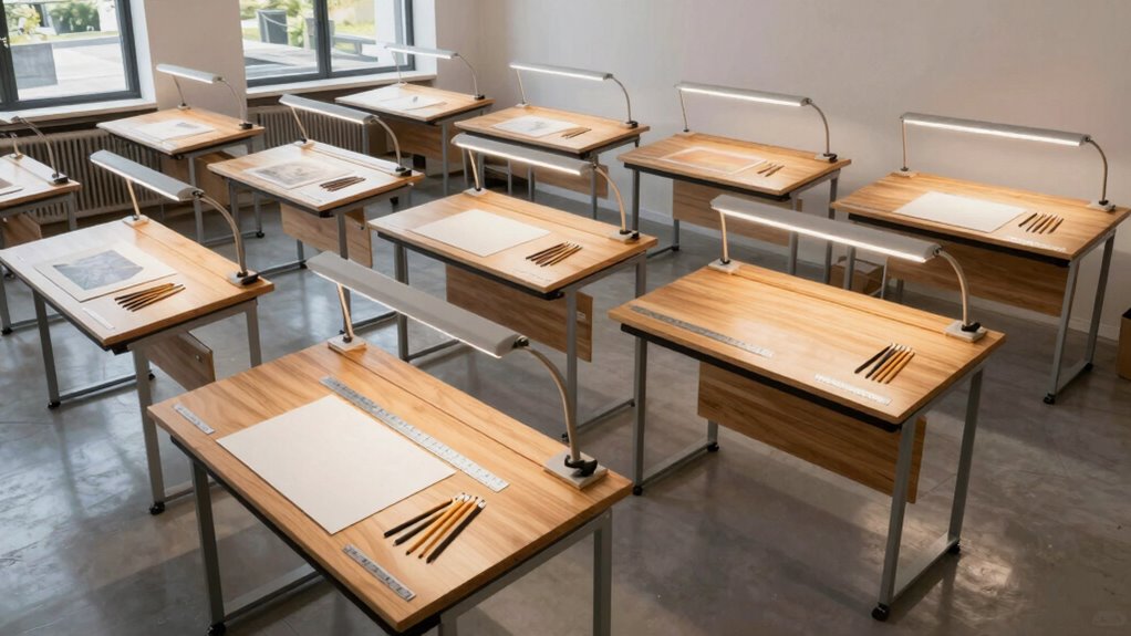 If you’re looking for the 15 best drafting tables for artists in 2026, I’ve found options that combine durability, adjustable features, and plenty of storage. Whether you need a sturdy tabletop with built-in lighting, versatile tilt angles, or mobile units for a flexible workspace, there’s something for every artist. These tables cater to different budgets and needs, ensuring comfort and efficiency. Keep exploring, and you’ll discover more details to help you choose the perfect one.