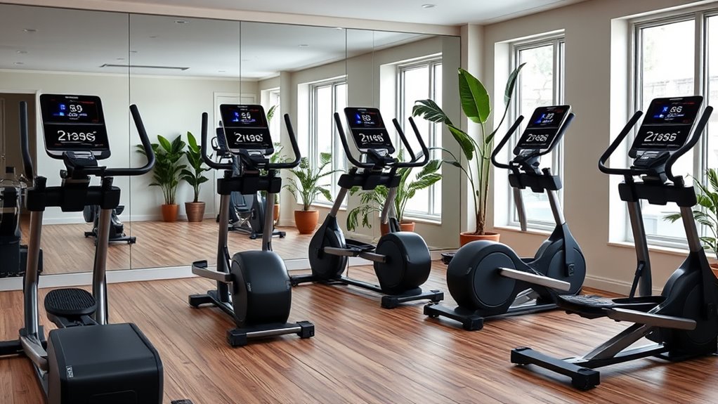 Think of safety features as your elliptical’s built-in guardian angels. I look for machines with emergency stop buttons, sturdy handrails, and non-slip pedals to keep me secure during workouts. Adjustable incline and resistance controls should be easy to operate, preventing sudden surprises. A well-lit display and clear instructions also help me stay focused and safe. These features give me peace of mind, so I can focus on crushing my fitness goals.