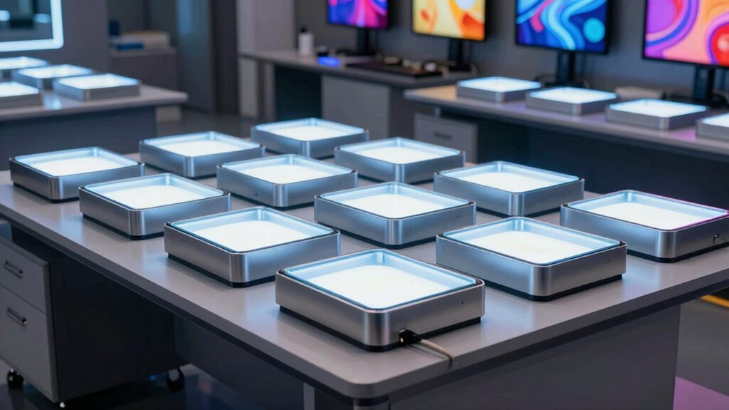 Having a versatile LED exposure unit is essential for accommodating various project needs and expanding your creative options. These units can handle a wide range of screen sizes, from small to large, ensuring compatibility with different projects. They support multiple applications like traditional screen printing, cyanotype, and photo emulsion processes, giving you workflow flexibility. Many models feature adjustable exposure times and customizable settings, allowing you to tailor the process to different materials and emulsion types. LED technology guarantees consistent, uniform light distribution across various screen dimensions, resulting in high-quality exposures. Additionally, some units include adjustable stands and multi-size frames, making it easy to switch between projects and application types without hassle, consequently enhancing your overall productivity and creative potential.