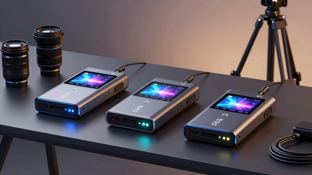 I find that portable recording batteries like the Anker PowerCore series, DJI Ronin Power, and V-Mount batteries are the best options. They’re reliable, offer high capacity, and can last through long shoots. I always carry a few spares, especially V-Mounts for heavier gear. Using a mix guarantees I never run out of power unexpectedly. Plus, quick-charging features help me stay ready for my next shot.