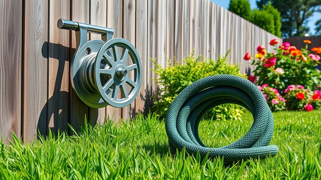 Choosing weather-resistant materials for a hose reel is like picking a suit for all seasons—I want durability. I recommend stainless steel or aluminum because they resist rust and corrosion, even in rain or sun. Heavy-duty plastic can also work well if it’s UV-stabilized. These materials stand up to harsh weather, ensuring my reel lasts longer and keeps my garden tools organized without worry.