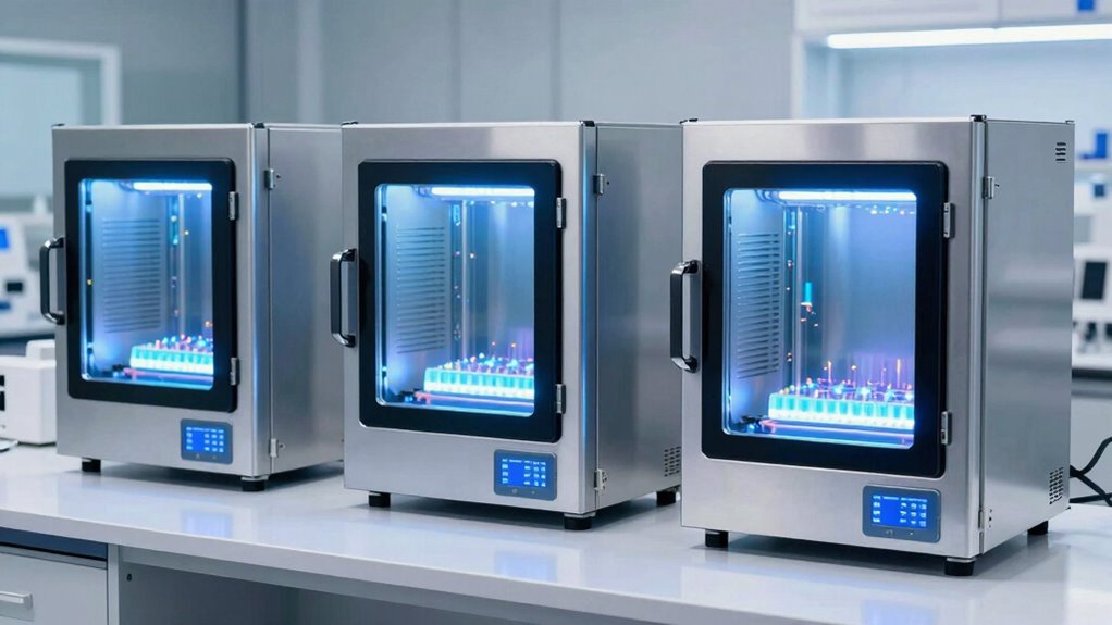 You might think that large resin volumes require special safety features, and you’re right. These chambers often include temperature and humidity controls, automatic shutoffs, and reinforced safety doors to prevent accidents. I’ve found that manufacturers prioritize safety, ensuring users are protected from fumes, heat, and potential resin spills. So, if you’re handling big batches, rest assured, these chambers are designed with your safety in mind.