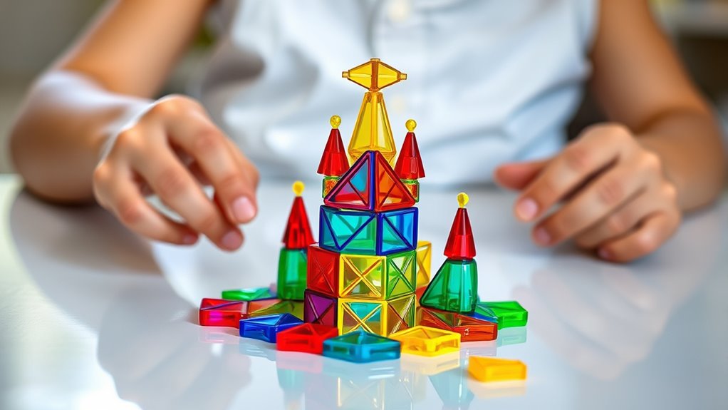 How do you pick the right magnetic tiles for a child’s age and developmental stage? It’s vital to consider both safety and challenge level. Most sets are recommended for kids aged 3 and up, but some are designed for younger or older children based on size and complexity. For ages 3-5, look for larger, rounded tiles that are easy to grasp and reduce choking risks. Older kids, 6 and above, can handle smaller tiles and more intricate sets that encourage advanced building and STEM skills. Safety features like rounded edges and non-toxic materials are essential for all ages. Ultimately, choosing a set that matches your child’s motor skills and cognitive abilities guarantees they stay engaged, safe, and challenged appropriately.
