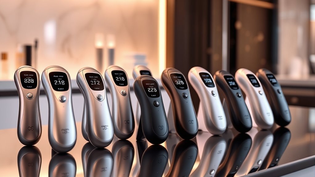 When selecting a microcurrent device, making certain to find a balance between features and cost guarantees you’re getting good value for your money. I recommend comparing the device’s price to professional treatments to see potential savings over time. Check if it includes essential accessories like conductive gels or treatment guides—these can enhance your experience without extra costs. Durability and reliable performance are crucial; a well-made device justifies a higher initial investment. Also, consider whether the price reflects its technology level, safety features, and positive user reviews indicating effectiveness. Ultimately, a device that offers a good mix of advanced features, safety, and longevity will serve you best and provide real value as part of your skincare routine.