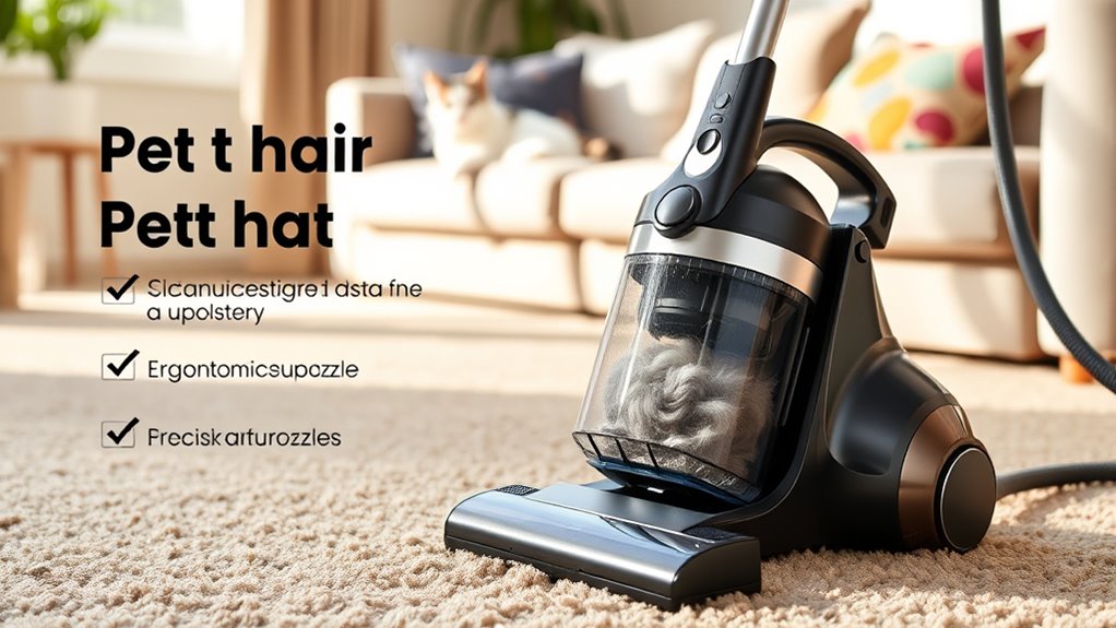 To improve pet hair pickup and removal, I look for vacuums with strong suction power and specialized brushes that loosen hair embedded in carpets and upholstery. Features like tangle-free brush rolls and powerful suction on hardwoods help prevent hair from clogging. I also prefer models with adjustable height settings and HEPA filters, which boost cleaning efficiency and guarantee allergens are captured effectively, making my space cleaner and healthier.
