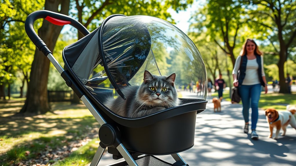Pet comfort plays a key role in ensuring enjoyable outings for both you and your pet. When choosing a stroller, look for ample ventilation with breathable mesh panels to keep fresh air circulating. Padded interiors, plush cushions, or foam bottoms make long trips more comfortable and help prevent discomfort. Adjustable canopies or windows are great for providing shade or allowing pets to face outward, reducing stress. Spacious interiors with secure leashes or harness attachments help pets feel less cramped and anxious. Additionally, removable liners and breathable materials make cleaning easy and maintain a cozy, hygienic environment inside the stroller. Prioritizing these comfort features guarantees your pet stays relaxed, happy, and comfortable during every adventure.