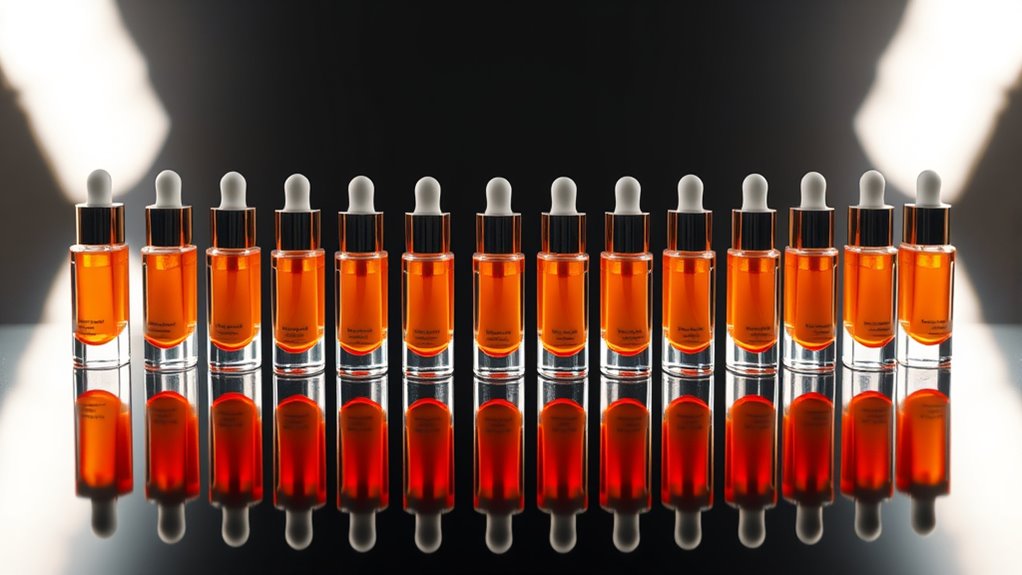 Incorporating additional beneficial ingredients into a vitamin C serum can considerably enhance its effectiveness and provide targeted skin benefits. For example, ingredients like hyaluronic acid, vitamin E, and ferulic acid boost antioxidant power, offering extra hydration and protection against environmental damage. Botanical extracts such as aloe vera, rosehip oil, or green tea soothe inflamed skin and enhance anti-inflammatory effects, complementing vitamin C’s brightening properties. Including retinol or peptides can improve skin elasticity, reduce fine lines, and support collagen production for a more youthful look. Niacinamide helps diminish hyperpigmentation and evens out skin tone, working synergistically with vitamin C. Combining these ingredients results in a more exhaustive approach to skin revitalization, making your serum not just brightening but also deeply nourishing and protective.