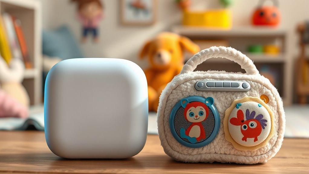 When evaluating devices for your child, parental controls are a key aspect to contemplate. Both Yoto and Toniebox prioritize safety by excluding cameras, microphones, and ads, creating secure environments. Yoto offers app-based management, allowing me to set content limits, monitor activity, and even approve or customize content with the Make Your Own card feature, giving me control over what my child listens to. Toniebox’s app also provides easy oversight, letting me manage the content library, adjust volume, and track listening time. This flexibility helps guarantee my child’s entertainment remains safe and age-appropriate. Overall, both devices provide effective parental controls, but the specific features and management options can influence which one better suits my needs and peace of mind.